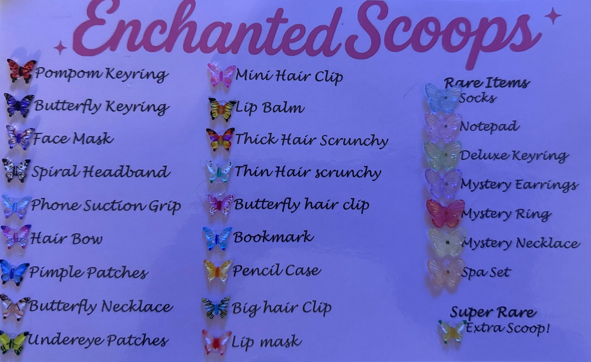 Welcome to the magical world of Enchanted Scoops, where every scoop is filled with surprises! Our mystery scoop boxes are carefully packed with a delightful mix of cute and trendy items, making every order a fun unboxing experience.